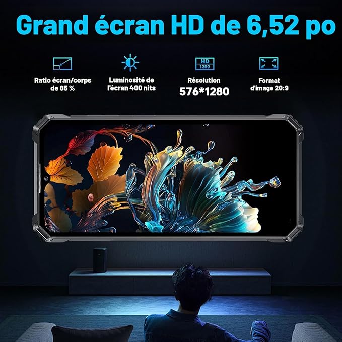 Batterie de grande capacité de 10600 mAh et OTG : le téléphone robuste OUKITEL WP28 S est équipé d'une batterie de 10 600 mAh. Il prend en charge 1000 heures de veille, 60 heures d'appels, 18 heures de vidéos et 50 heures de musique. Il peut fournir une alimentation plus durable lorsque vous jouez à de grands jeux ou regardez des vidéos HD. La fonction de charge inversée OTG peut alimenter d'autres appareils électroniques en cas d'urgence. Le smartphone robuste OUKITEL WP28S est plus adapté pour les voyageurs, les amateurs de plein air et les hommes d'affaires.