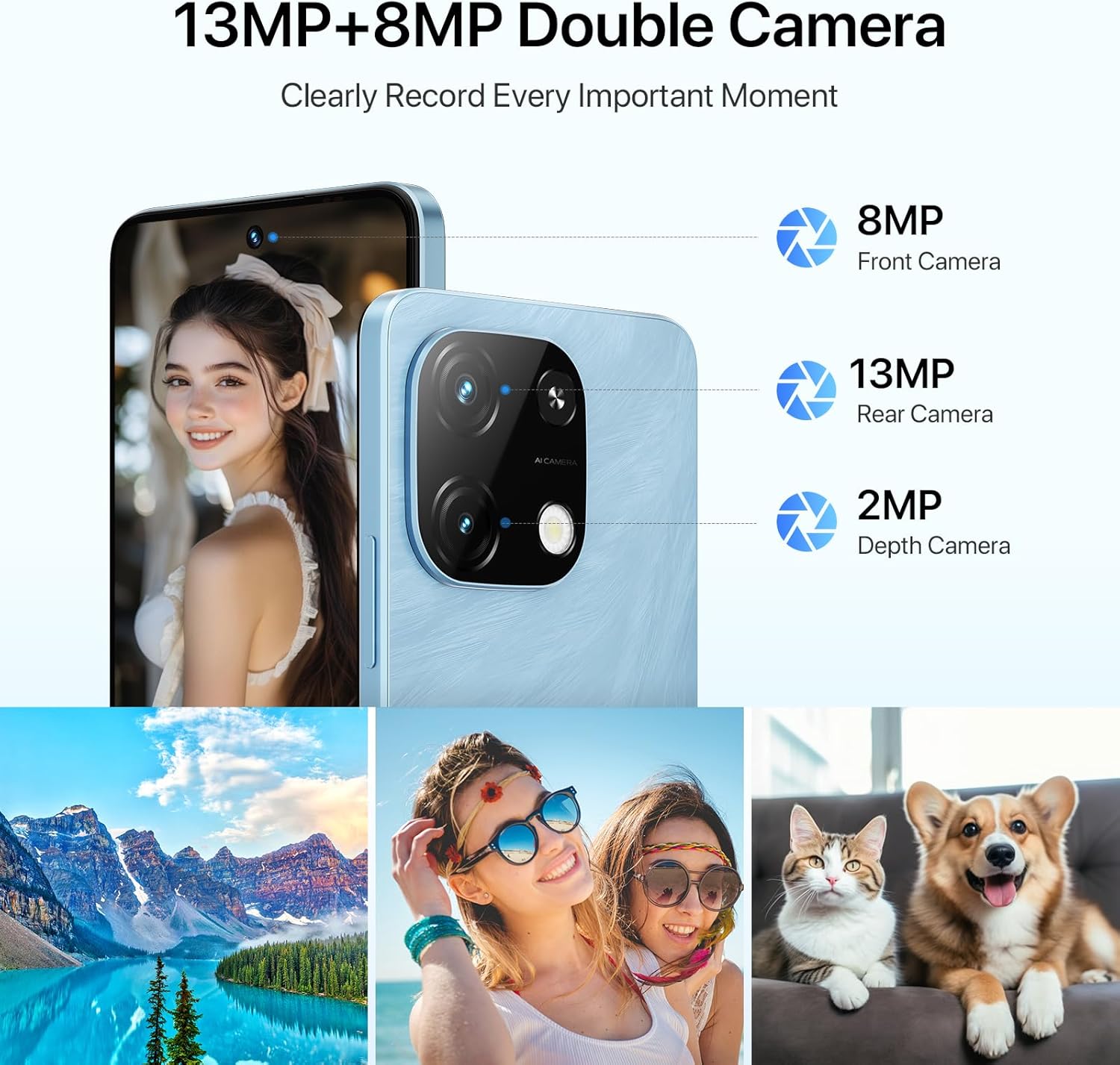 Le téléphone débloqué UMIDIGI Note 100A est équipé d'une configuration à double caméra, composée d'un appareil photo principal de 13 MP et d'une caméra macro 2 MP, ainsi que d'une caméra frontale de 8 MP. Le système de caméra prend en charge différents modes tels que Panorama, mode nuit et accéléré