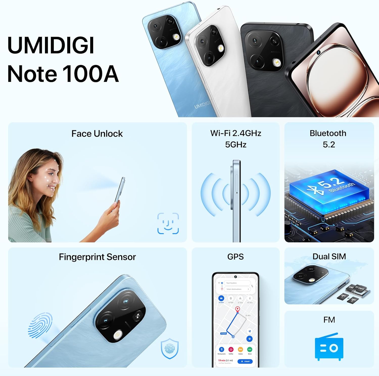 Le téléphone UMIDIGI Note 100A Android 14 dispose d'un ensemble complet de fonctionnalités, y compris la radio FM avec prise casque, la prise en charge OTG, le GPS et le Bluetooth 5.2